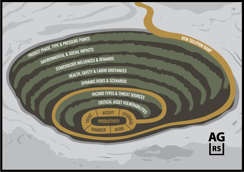 AG-RS has developed a project analysis methodology as a result, which we define as our Risk Solution Ramp. Level by level we drill into the baseline situation, analyze legacy issues and dig down to the root causes to find solutions for risks. This unearths the deliverables required for a pragmatic campaign to mitigate hazards and maximise productivity, as shown below:
